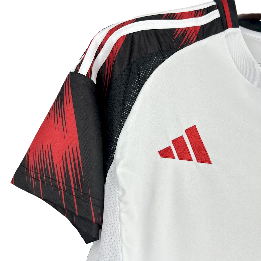 Para a temporada 25/26, a camisa reserva do Flamengo apresenta um design que combina a tradição rubro-negra com um visual moderno e impactante. Geralmente, a camisa Away do Flamengo é predominantemente branca, com detalhes em vermelho e preto, destacando as cores do clube de forma elegante e vibrante. É a camisa perfeita para o torcedor que acompanha o Mengão em todas as jornadas, mostrando sua paixão com estilo e atitude.