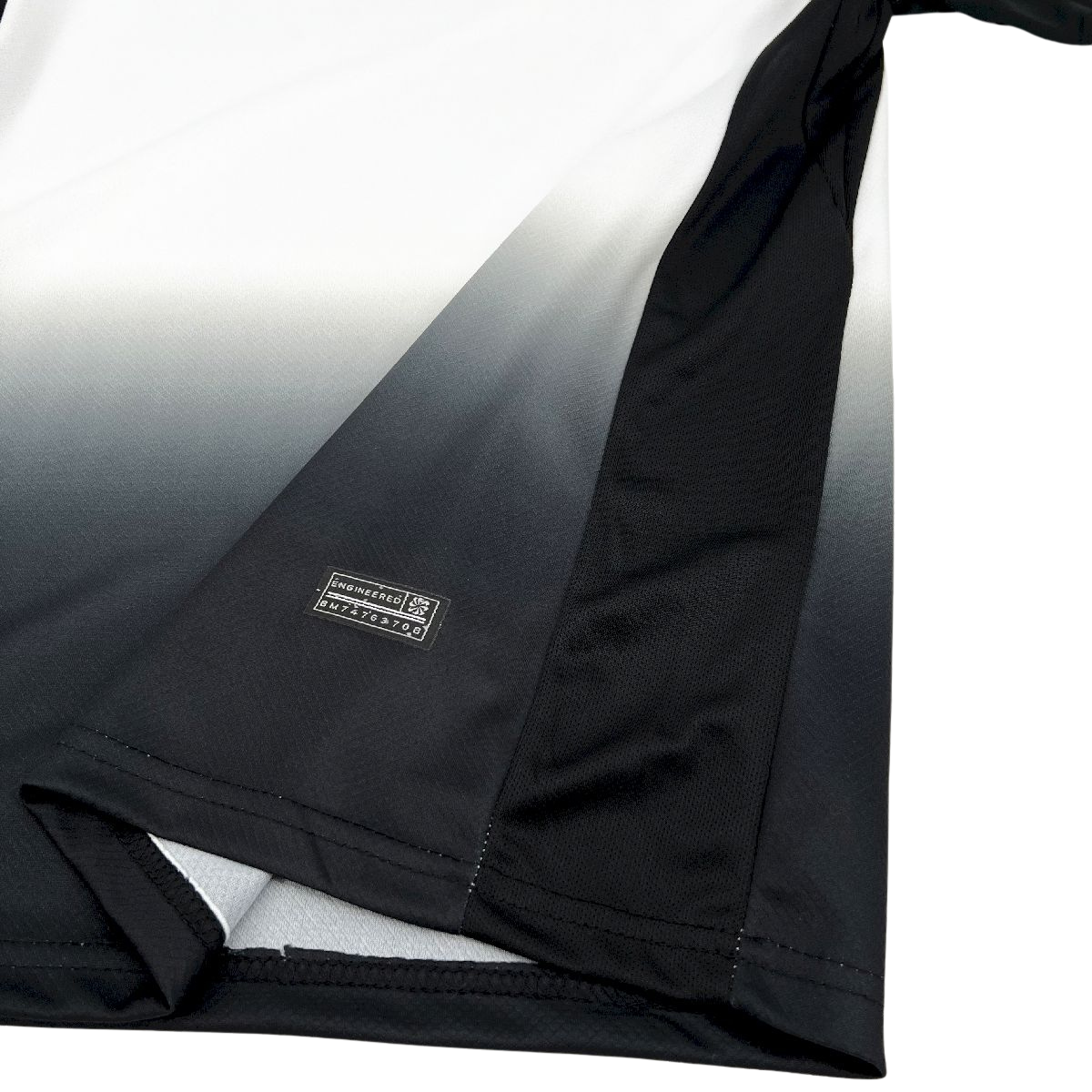 Predominantemente branca, a camisa se destaca pelo efeito degradê que vai do branco ao preto na parte inferior e nas mangas, criando um visual marcante e único. O escudo do Corinthians, aplicado em destaque no peito, reforça a identidade do clube, acompanhado do logo da Nike.