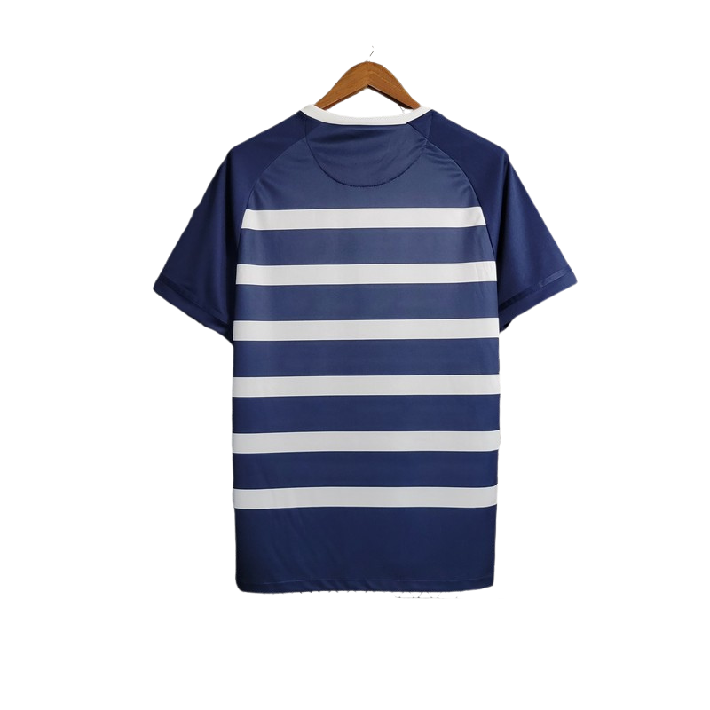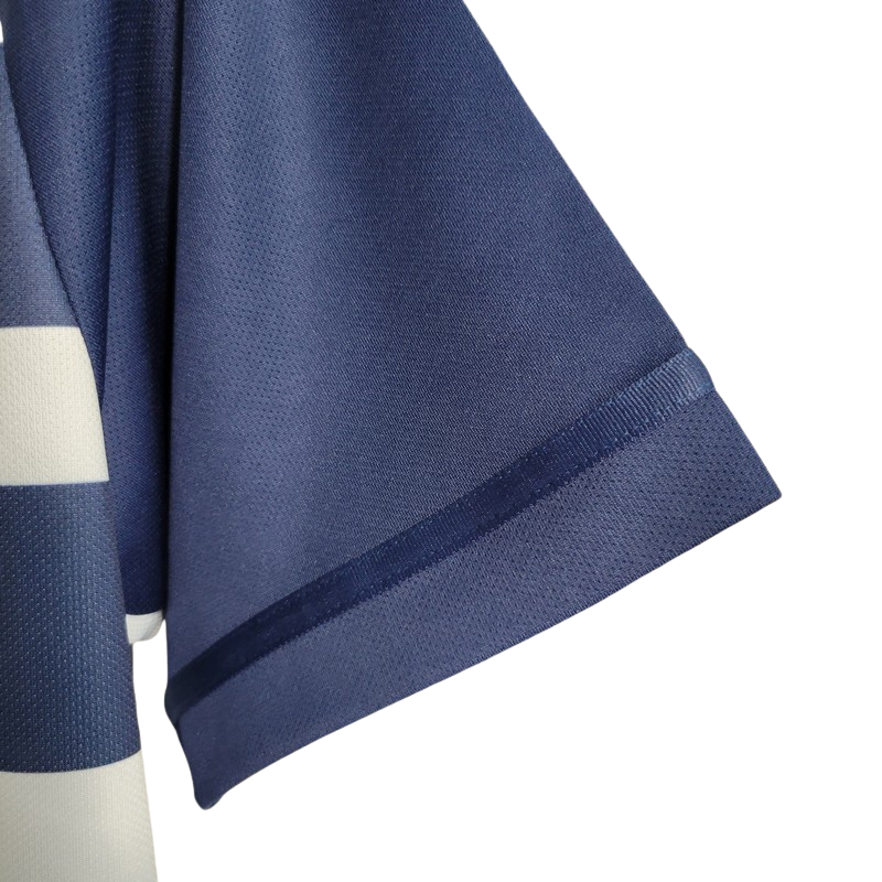 Com listras horizontais em azul marinho e branco, esta camisa oferece uma alternativa sofisticada aos tradicionais preto e branco. A gola polo preta e os punhos azuis complementam o visual. O patrocinador "CAIXA" e o logo da Nike se integram perfeitamente à estética da época.
