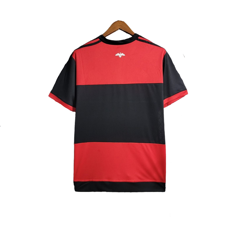 Com as tradicionais listras horizontais em vermelho e preto, esta camisa apresenta um design icônico. O logo da Adidas e o escudo do Flamengo se destacam no peito. .