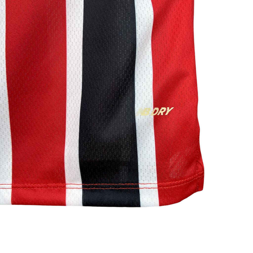 Para a temporada 25/26, a camisa reserva do São Paulo apresenta um design que combina a paixão tricolor com um visual moderno e impactante. Geralmente, esta camisa se destaca pelo predomínio das cores vermelha e preta, com ou sem listras, sobre um fundo neutro ou com grafismos sutis, mantendo a identidade única do clube. É a camisa perfeita para o torcedor que acompanha o Tricolor em todas as jornadas, mostrando sua paixão com estilo e atitude.